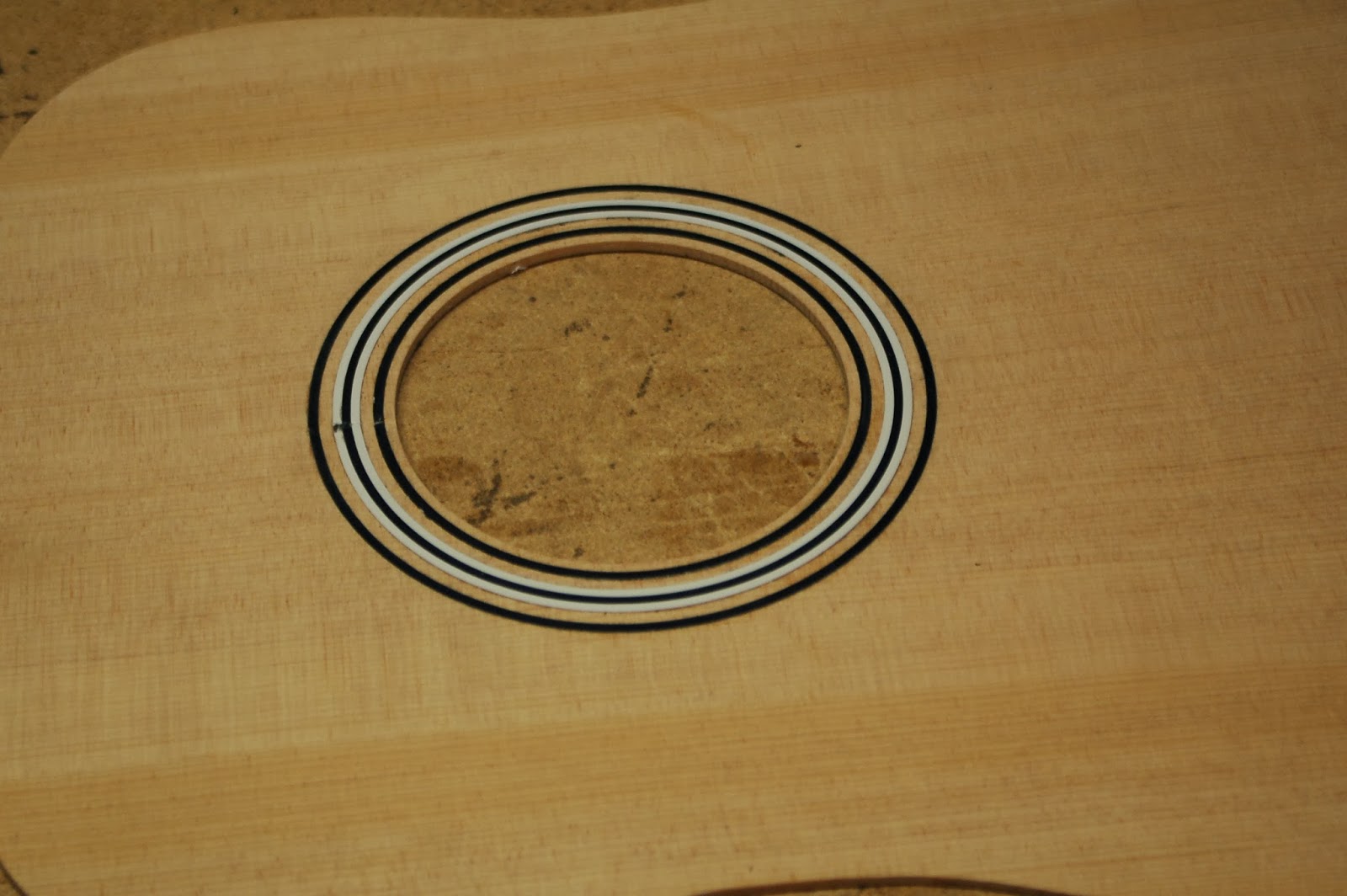 Shaping the top and finishing the rosette around the sound hole on the outside surface was the first step.